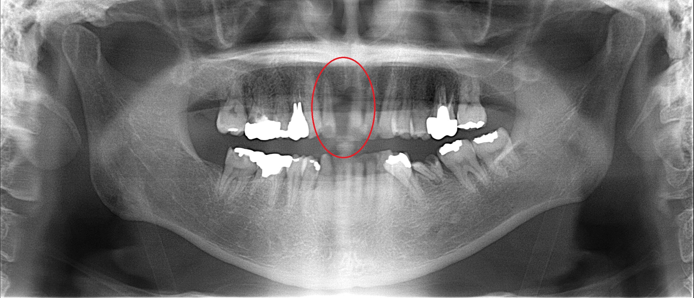 来院時のレントゲン 赤い丸の部分の歯がありません。
