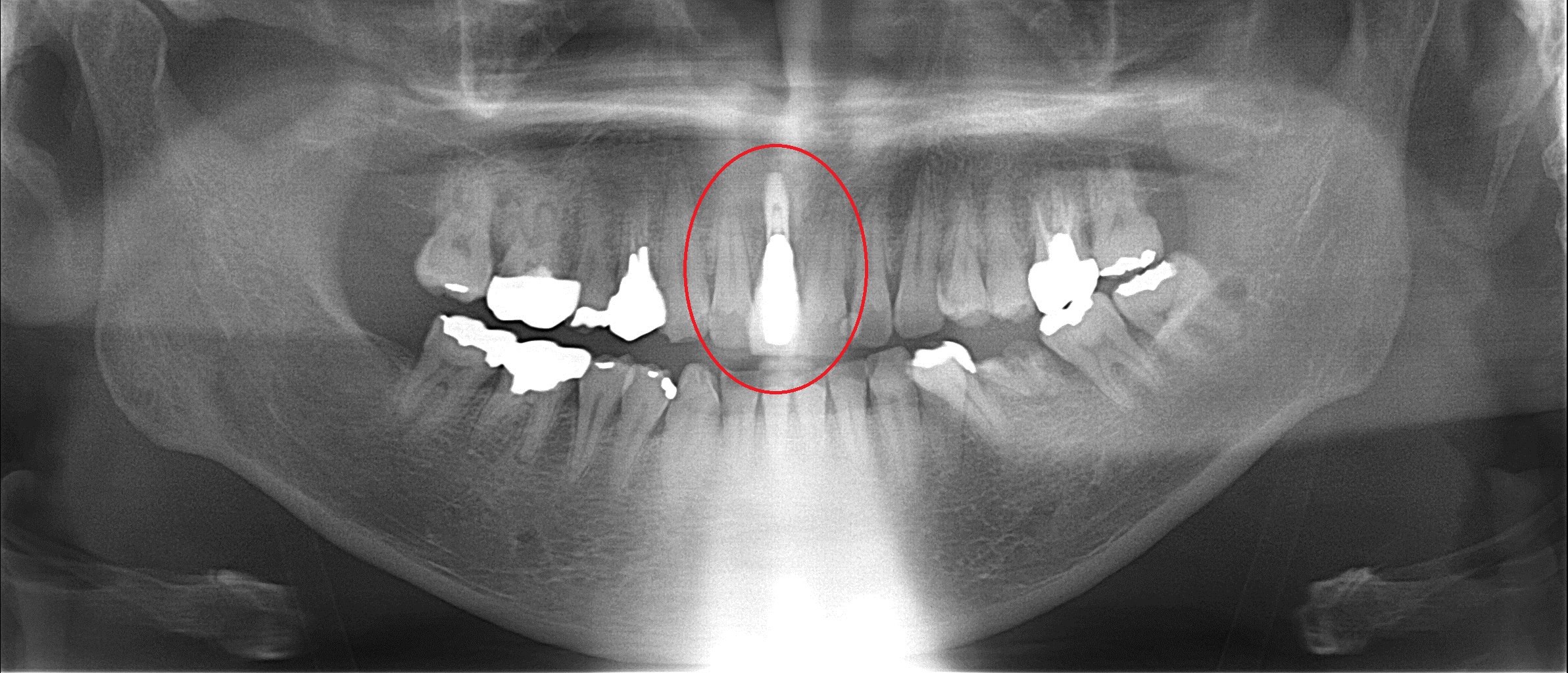 昨日の被せ物を装着後のレントゲン 赤い丸の部分にインプラントを埋入